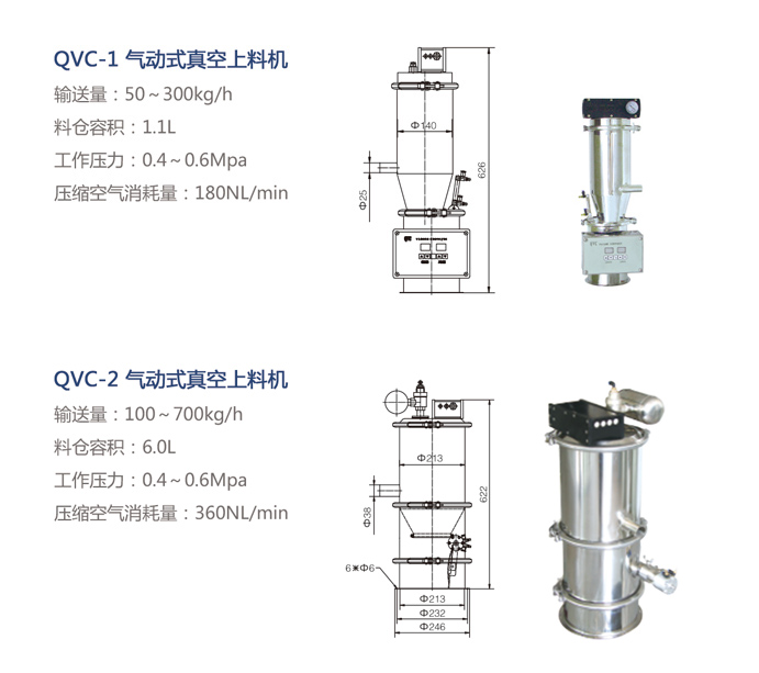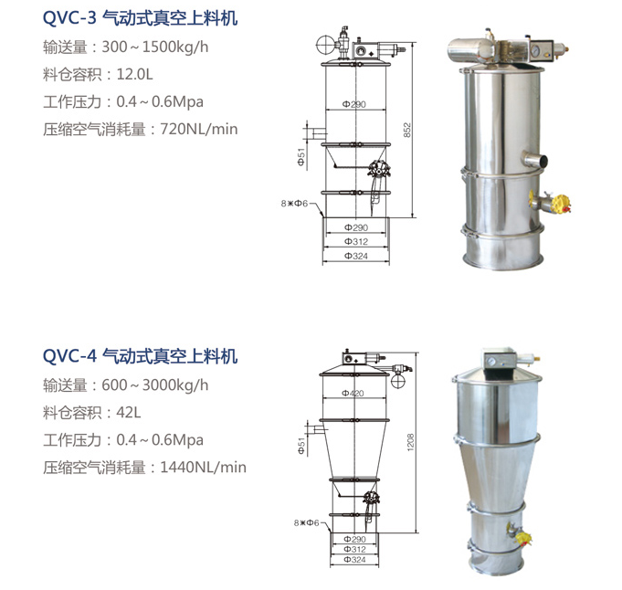 氣動式真空上料機是利用壓縮空氣通過真空發生器產生高真空實現對物料的輸送,不需要機械式真空泵,具有結構簡單、體積小、免維修、噪音低、控制方便、消除物料靜電和符合GMP要求等優點。真空發生器產生的高真空,使被輸送的物料杜絕了分層現象,保證了混合物料成份的均一性,是壓片機、膠囊填充機、干法制粒機、包裝機、粉碎機、振動篩等機械自動上料的設備。