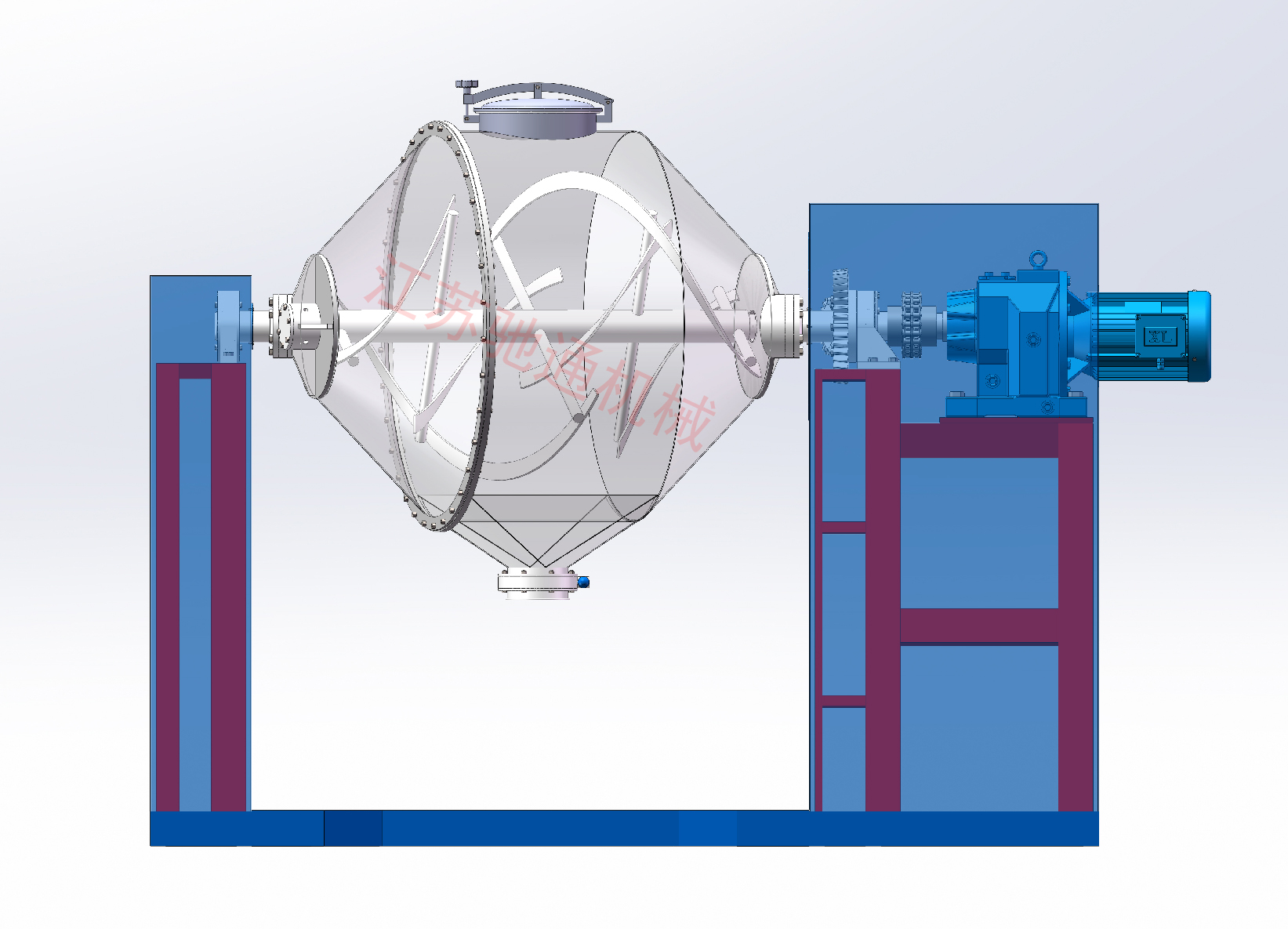 (三)雙錐筒進料口采用快開旋開閥,出料口采用大口徑90°旋閥,使用特別方便。